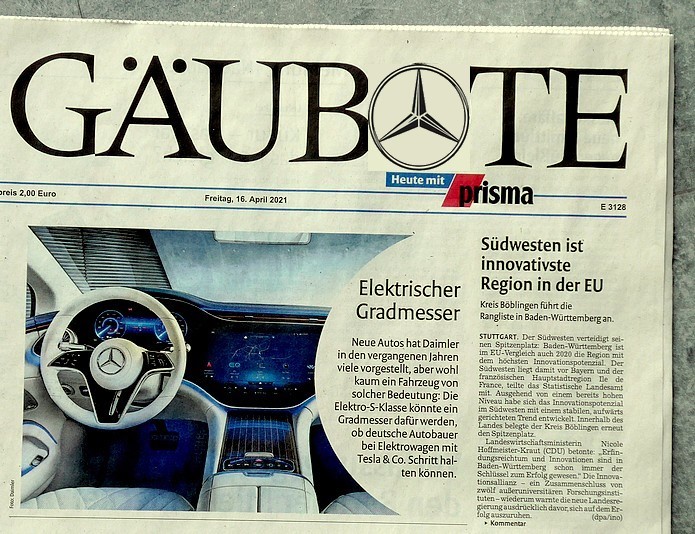 (19.04.2021) Der GÄUBOTE, die Lokalzeitung für Herrenberg und das Gäu, hat die STUTTGARTER NACHRICHTEN (StN) als Mantelblatt. Die STUTTGARTER NACHRICHTEN sind so etwas wie die Hauszeitung des Daimler-Konzerns. Klaus Köster ist Redakteur des Wirtschaftsteils. Im GÄUBOTE vom 15. April 2021 auf Seite 2 beweihräuchert er das neue Luxus-E-Auto Mercedes EQS: (nachlesen: hier)