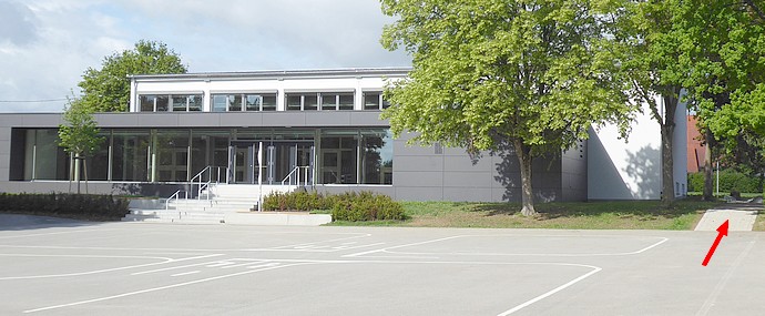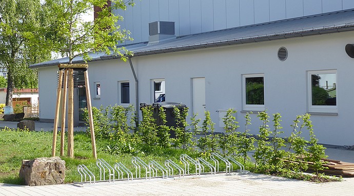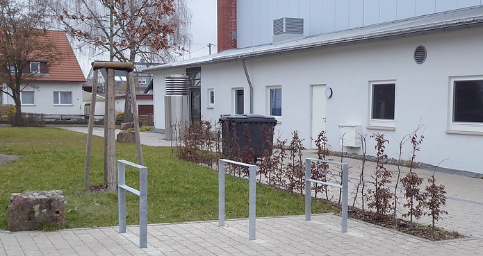 Sie ist schon ein Prachtstück, die frisch renovierte Kuppinger Gemeindehalle. Vorne der große Platz für die Besucherautos. Und die Radabstellanlagen? Da muss man rechts an die Seite fahren...