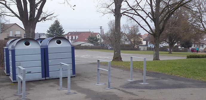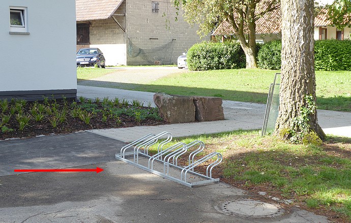 Bemerkung: Eine am 23. April abgeschickte Anfrage an die Stadtverwaltung und den Kuppinger Ortschaftsrat, doch bitte zeitgemäße Anlehnbügel anzubringen, wurde nicht beantwortet. Im Gegenteil: die damals noch lose deponierten "Felgenbrecher" wurden fest im Boden verankert.