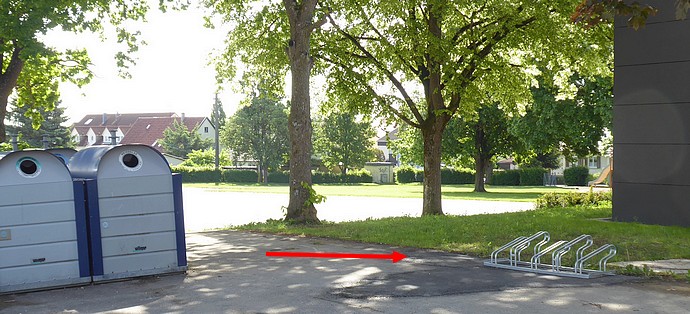 Die Rückseite der Gemeindehalle wird nicht so streng überwacht, deshalb ist man hier großzügig, es könnten ja unerwartet noch ein paar Radler mehr kommen. Stein und Metall sind kunstvoll in Szene gesetzt: rustikale Massivität kombiniert mit filigraner Leichtigkeit in horizontaler Symbiose. Das edle Ensemble verpflichtet zu sorgfältigem Umgang. Das Vorderrad ist in absolut senkrechter Ausrichtung einzustellen, dabei dürfen benachbarte Fahrräder keinesfalls touchiert werden. Andernfalls sind Schäden an Speichen und Felgen durch Verklemmkippungen und Verkippklemmungen nicht auszuschließen. Der Hausmeister bittet, vollends fahruntüchtige Fahrräder, anstatt sie im Vertrauen auf Entfernung durch das Ordnungsamt einfach stehen zu lassen, doch bitte im bzw. neben dem großzügig dimensioniertenen Müllcontainer hinter der Buschreihe zu deponieren.