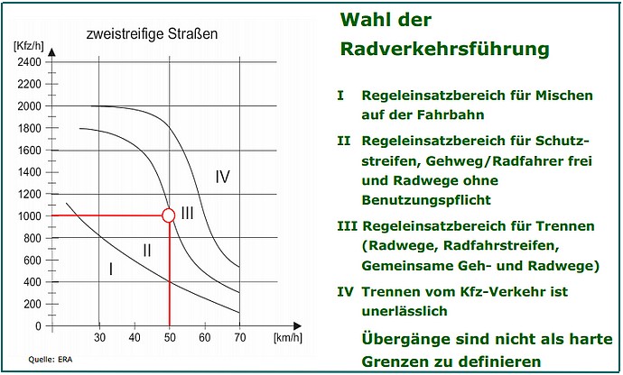 Achtung: Die y-Achse stellt die Verkehrsdichte in der Spitzenstunde dar. Demnach wären Schutzstreifen gerade noch zulässig bei Tempo 50 kombiniert mit einer Verkehrsdichte von 1000 KFZ / h in der Rush Hour. In der Hindenburgstraße würde dieser Wert für die Verkehrsdichte in der Rush Hour vermutlich mehrfach überschritten, hat sie doch schon im Schnitt eine Belastung von etwas über 1000 KFZ / h.