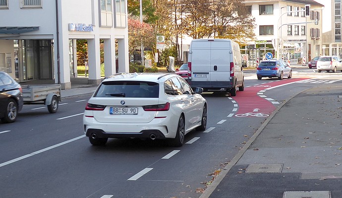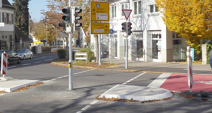 Nach § 42 Abs. 6 Nr. 1 g StVO dürfen andere Fahrzeuge ( d.h. Kfz) Schutzstreifen nur bei Bedarf überfahren. Es handelt sich bei Schutzstreifen nicht um Radwege und auch nicht um Sonderwege (man spricht dabei von Angebotsstreifen). Es ist gesetzlich nicht bestimmt, dass ein solcher Schutzstreifen benutzt werden muss. Es besteht für Radfahrer keine Pflicht, nur innerhalb der Linien des Schutzstreifens zu fahren (siehe Beschl. OVG Lüneburg vom 25.7.2018- Az 12 LL 150/16). Allerdings gibt es auch für Radfahrer das Rechtsfahrgebot, was eine Nutzung des Schutzstreifens fast unausweichlich macht. Wenn Radfahrer z.B. von der Hindenburg- zur Nagolder Straße fahren wollen *), sind sie daher nicht verpflichtet, am Reinhold-Schick-Platz auf den Gehweg zu fahren und die Fußgängerampel zu benutzen. Sie können sich auch vor der Ampelanlage vom Schutzstreifen lösen und auf die Fahrbahn in Richtung Nagolder Str. wechseln, und auf der Fahrbahn auch bleiben und diese benutzen.