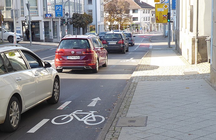 Der Bogen um die Bushaltestelle kurz vor dem Schick-Platz ist zulässig. Die gesetzlich vorgeschriebenen Mindestmaße für die Kombination Schutzstreifen - KFZ-Bereich wurden eingehalten.