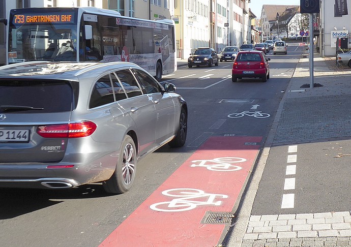(03.12.2020) Herrenberg ist eine von fünf Kommunen, die vom Bundesverkehrsministerium zur "Modellstadt Saubere Luft" ernannt wurden. Knapp 4 Millionen Euro Fördergelder müssen bis Ende 2020 sinnvoll eingesetzt werden, um den NOx-Ausstoß in der Herrenberger Innenstadt zu verringern. Zu den Maßnahmen gehören auch die Radschutzstreifen entlang der Hindenburgstraße.