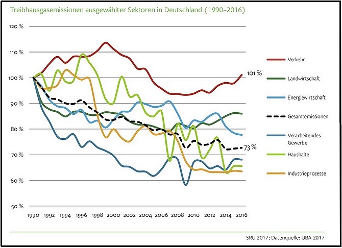 Der Verkehrssektor ist derzeit für etwa ein Fünftel der Treibhausgasemissionen Deutschlands verantwortlich. Während in anderen Sektoren seit 1990 bis heute zum Teil deutliche Emissionsminderungen erzielt wurden, sind die Emissionen des Verkehrs im gleichen Zeitraum sogar leicht angestiegen (Bild). Der größte Teil der Treibhausgasemissionen stammt dabei aus dem Straßenverkehr. Verbesserungen der Fahrzeugeffizienz sind durch die gleichzeitige Zunahme der Verkehrsleistung, der Motorenleistung und des Gewichts der Fahrzeuge aufgezehrt worden.