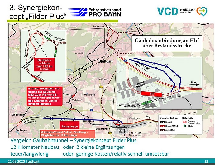 September 2020: VCD und ProBahn stellten eine neue Variante der Gäubahn-Anbindung in den Tiefbahnhof vor, ohne Umstieg. Die Panoramabahn wird in den Tunnel Bad Cannstatt eingeschleift, der direkt in den Tiefbahnhof mündet (siehe Bild, Kasten links oben). Ein Teil der Einschleifung wäre in der P-Option schon enthalten .