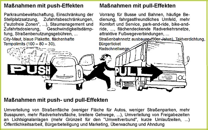 Wahrscheinlich wurde der Begriff Push&Pull das erste Mal im Jahr 1993 von Prof. Hartmut Tropsch (Wuppertal-Institut) für das Thema Verkehr verwendet. Prof. Tropsch ist auch als Quelle für die Grafik angegeben. Im Internet: Herkunft der Grafik hier.