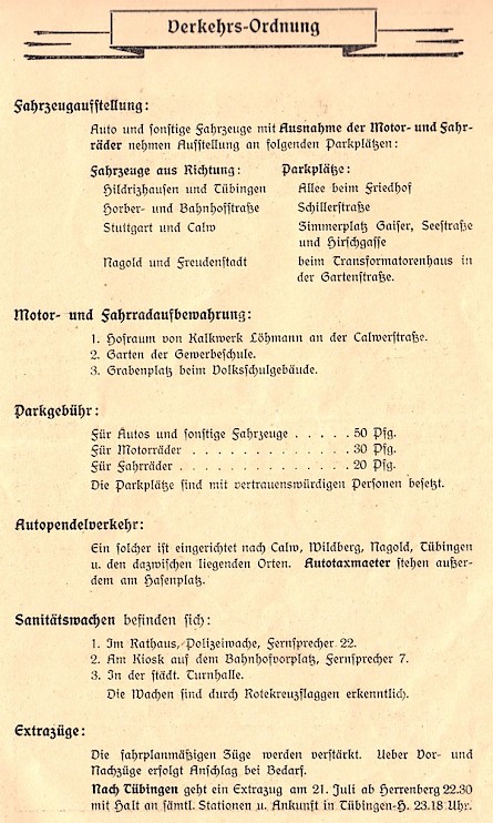 Man beachte auch den "Autopendelverkehr" in die umliegenden Orte und den Extrazug nach Tübingen. Sogar ein Parkleitsystem wurde eingerichtet, damals hieß das "Fahrzeugaufstellung".