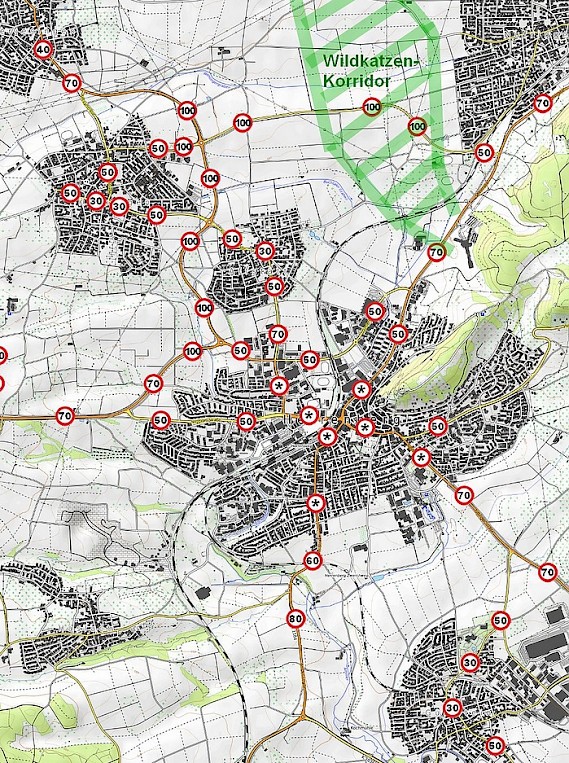 (24.04.2022) Auf Straßenabschnitten ohne beschilderte Geschwindigkeitsbeschränkung ist automatisch Tempo 100 erlaubt. Derartige Abschnitte finden sich gehäuft im Norden von Herrenberg, warum auch immer. Man beachte die ortsnahen Straßen, besonders die Nordumfahrung. Der "Wildkatzen-Korridor" wurde 2017 vom BUND angelegt (Umwidmung ehemals landwirtschaftlicher Flächen zu Brachland; es wurden viele hundert Büsche gepflanzt).