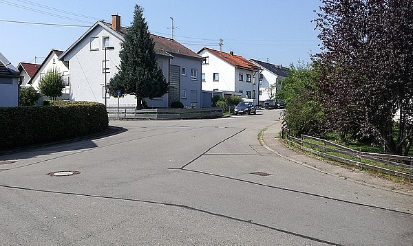 So baute man in den 70er Jahren. Man beachte insbesondere die Gehweg"breite" rechts im Bild. Wenn man bedenkt, dass der Quadratmeter Bauland in Kuppingen einen halben Tausender kostet, liegt hier viel Geld unter Asphalt. Der Platz ist biologisch tot und auch sonst absolut nutzlos. (Fotografiert in Kuppingen im August 2019)