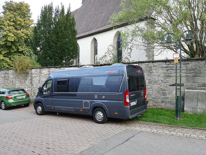 Parken auf einer öffentlichen Grünfläche. Eigentlich dient sie zur Verschönerung des Ortsbildes. Kuppingen, Stephanuskirche, 23. 09. 2023.