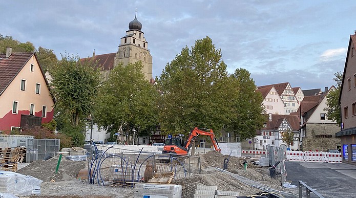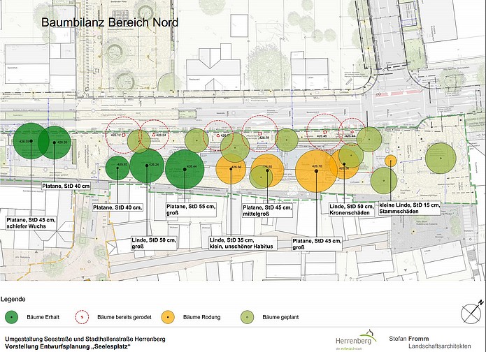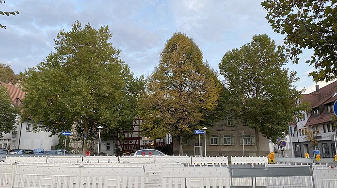 (...) Ein weiteres wichtiges Gestaltungselement ist die Begrünung. Um dem Platz eine lockere, der linearen Grundform entgegenwirkende Atmosphäre zu verleihen und gleichzeitig den Blick auf die historische Altstadt mit der Stiftskirche zu öffnen, wird ein lockeres Baumdach unter Erhalt und Einbeziehung eines Teils der vorhandenen Bäume vorgeschlagen. Im nördlichen Bereich müssen für die Realisierung des „Seeles“ noch vier Bestandsbäume entfernt werden, darunter eine Linde, die bereits starke Schäden aufweist und ohnehin in naher Zukunft gefällt werden müsste, sowie zwei relativ klein gewachsene Bäume (eine Linde und eine Platane). Von den großen, etwa 30 Jahre alten Bäumen im nördlichen Platzbereich (zwischen Fa. Kettner und Zufahrt Nufringer Tor, also heutiger Parkplatzbereich) werden - einschl. der bereits entfernten Bäume entlang der Seestraße - insgesamt 10 Bäume gerodet und 11 Bäume neu gepflanzt. 5 Bäume werden erhalten. Damit sind nach der Umgestaltung 13 Bäume auf dem neuen Platz geplant (vorher 15 Bäume).