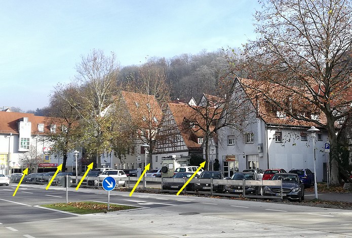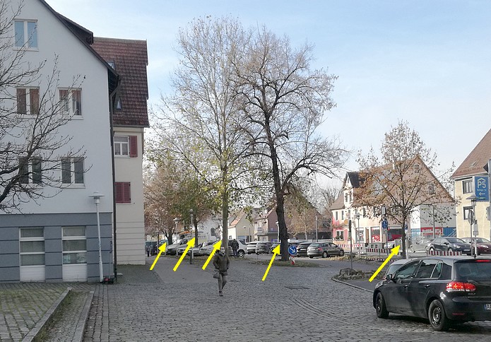 Zwei Fotos zur Visualisierung, aufgenommen am 21. 11. 2020. Man stelle sich die zu fällenden Bäume (gelbe Pfeile) in der warmen Jahreshälfte vor: